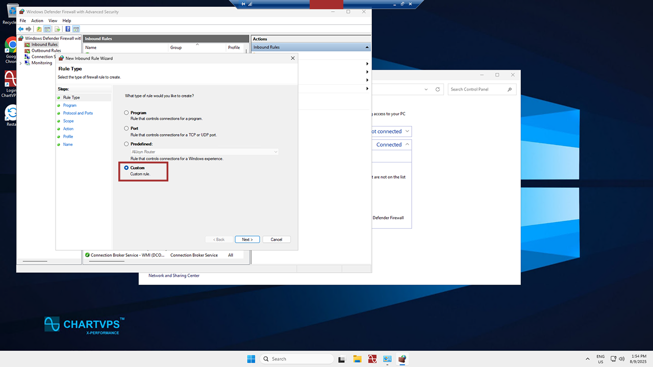 From the Rule Type page of the now-open New Inbound Rule Wizard, hit Custom, and then Next.