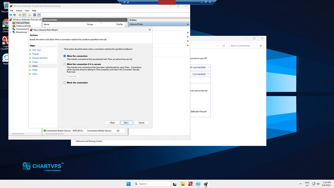 Welcome to the Action page! Select Allow the connection and hit Next once again.