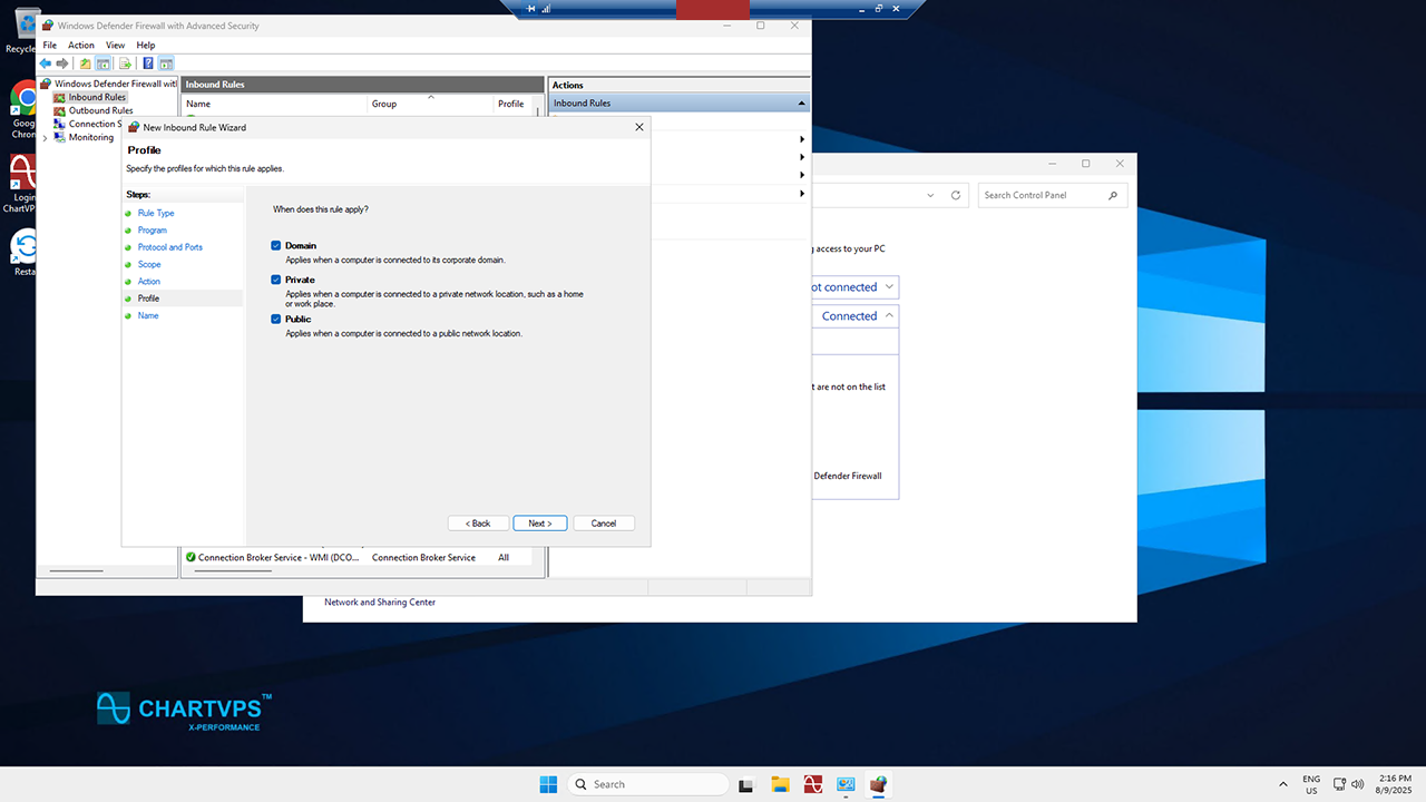 Second to last, it’s the Profile page. Pick the network location types that you want this rule to apply to, then click Next.
