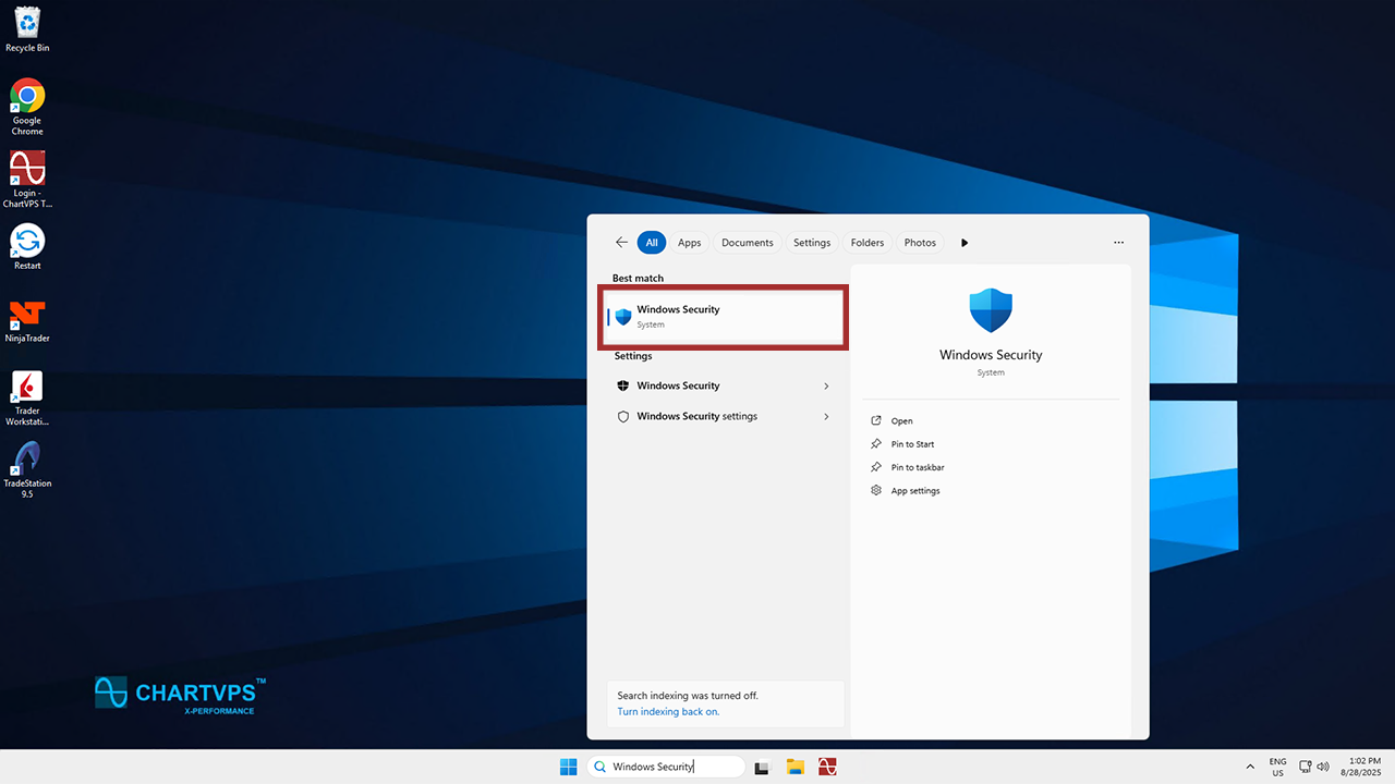Now let’s look at how to scan your server for malware. This time, search for the Windows Security app. Then, open that up.