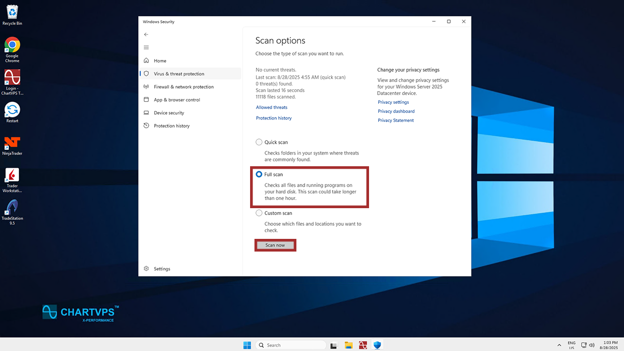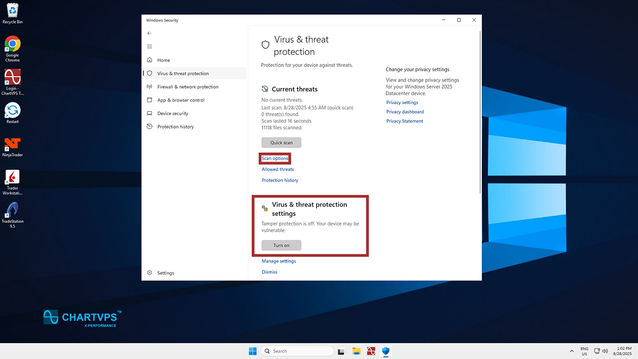 In this menu, make sure you have the Virus & threat protection settings turned on. That’s what will keep your server safe while you’re using it! After that, click Scan options.