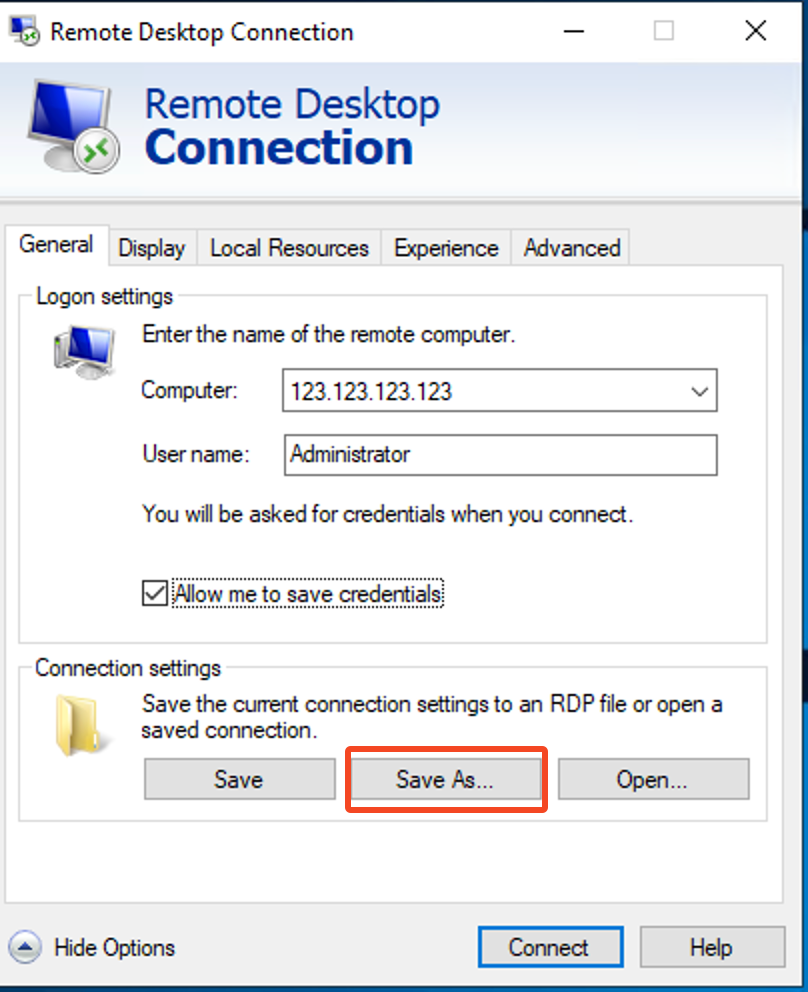 Make sure that Allow me to save credentials box is checked, so that the login information is saved with the Shortcut we are creating – this way you don’t have to keep entering the password every time you wish to connect to your server or VPS
