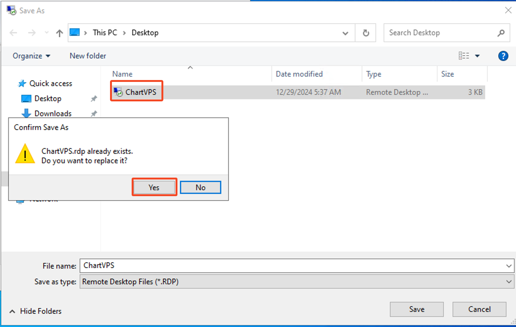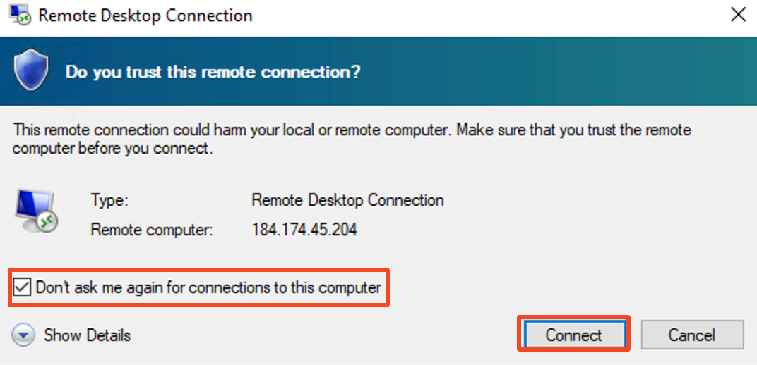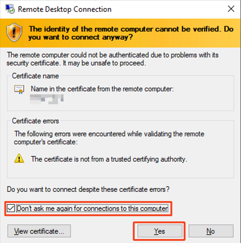 When you try to connect for the first time via the Shortcut, you may get two Dialog boxes to pop up. To not have them show up next time as well, make sure to check the box where it says “Don’t ask me again on this computer“, and click Connect or Yes to proceed to your VPS