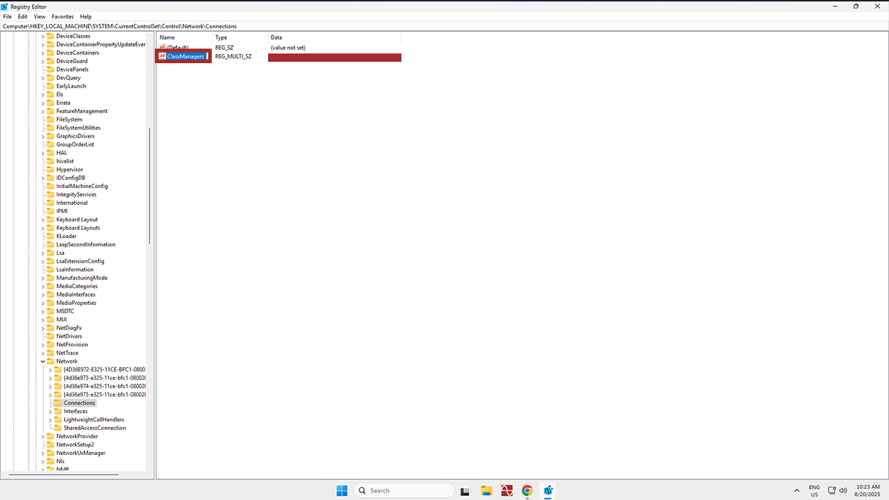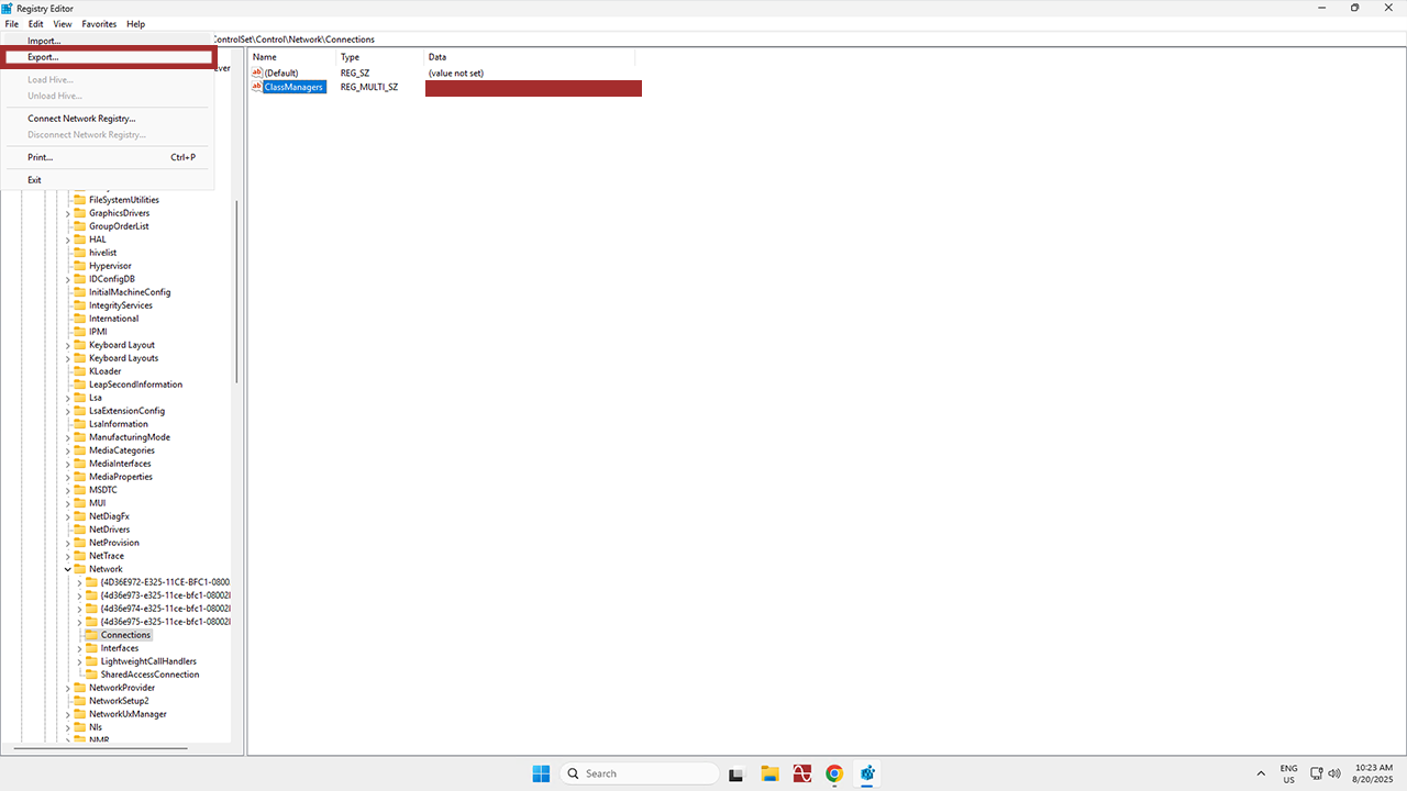 Now that the Registry Editor is open, it’s time to find and click on the registry key or subkey that you want to back up. For this example, we’ll use ClassManager in the Connections folder, but you have to choose whichever key or subkey is relevant to the changes you’re planning on making.