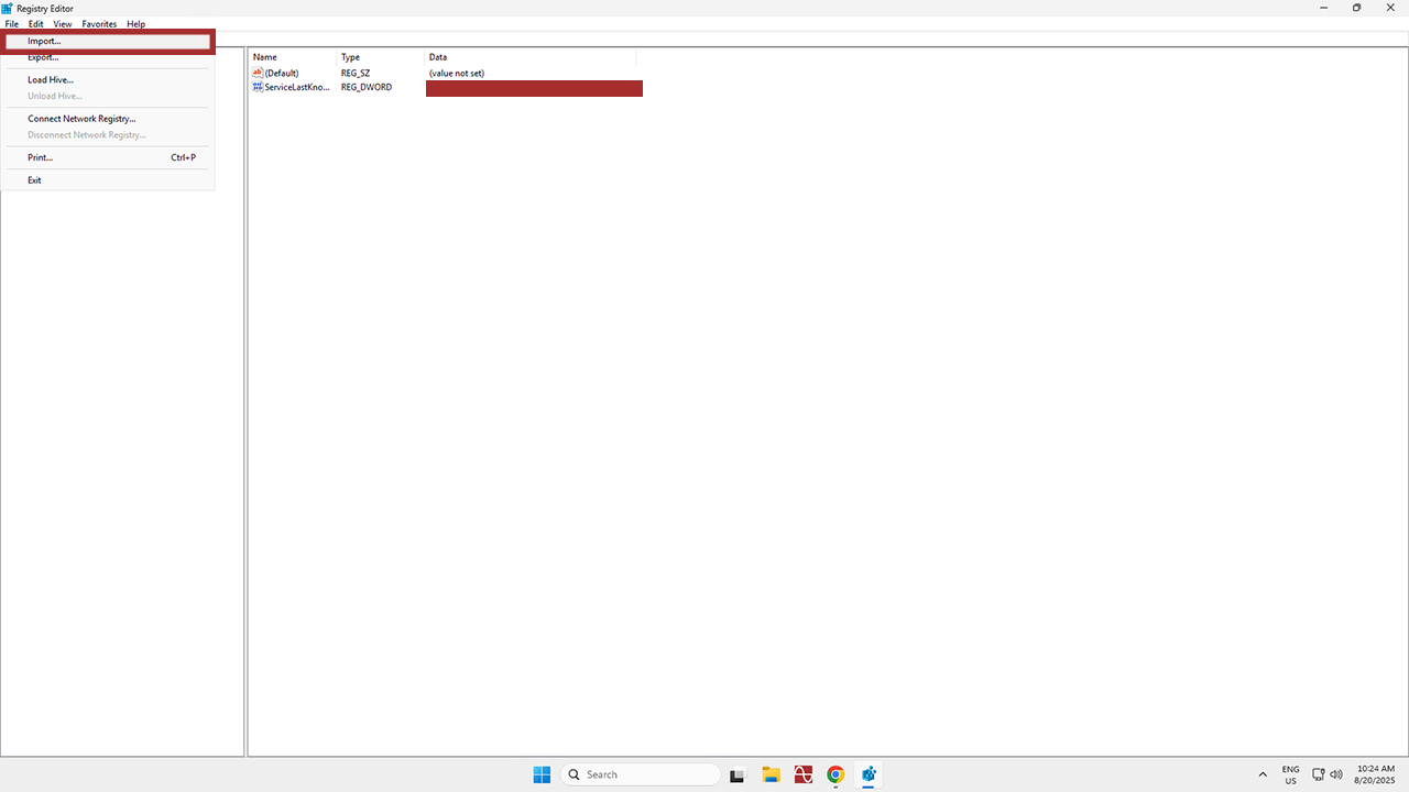 Once you’re back inside the Registry Editor, click File again, then select Import.