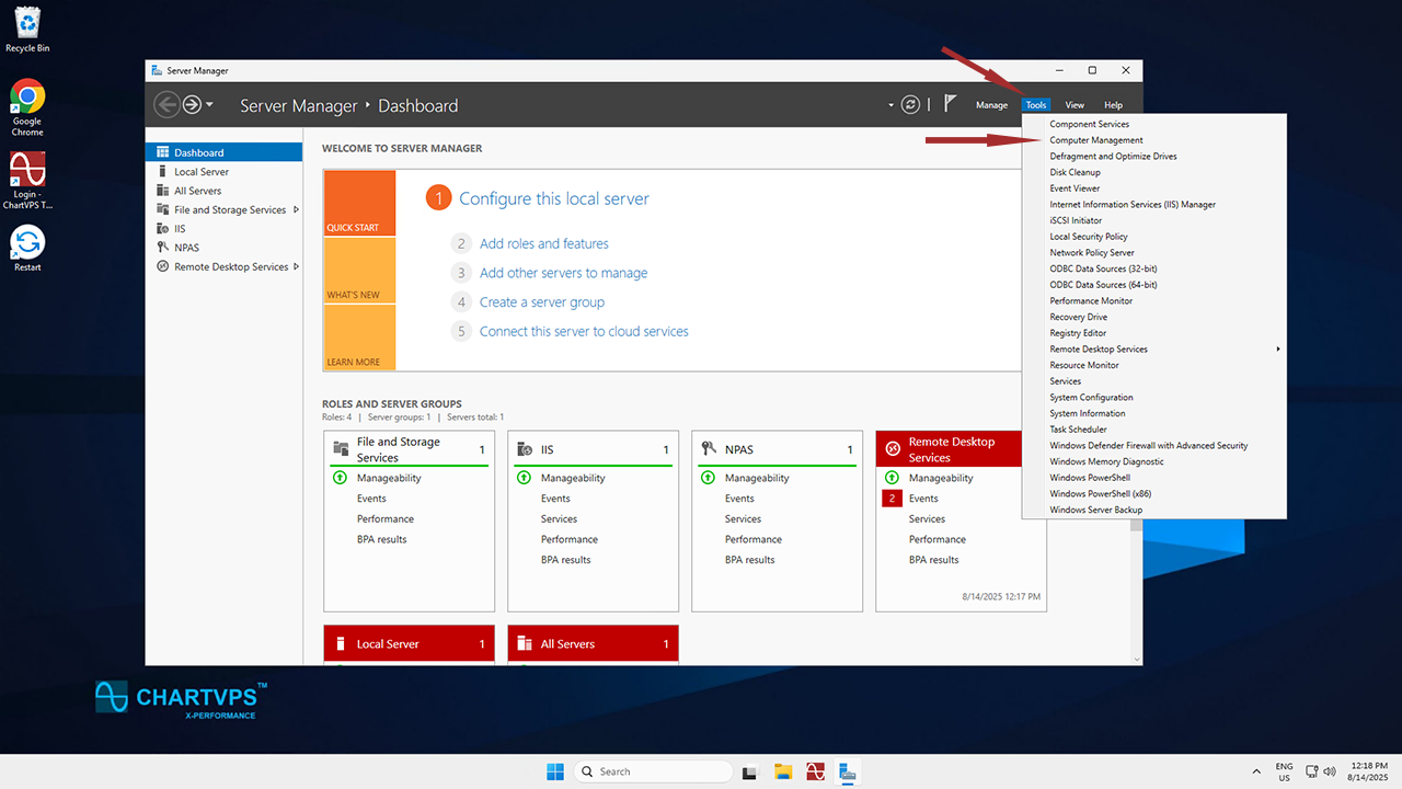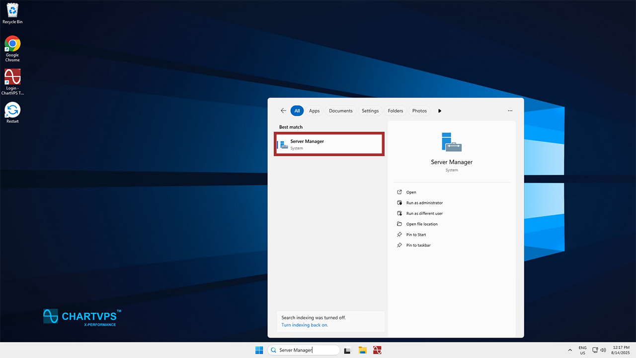 To simplify the login process going forward, feel free to uncheck the User must change password at next logon checkbox. Do that if you want to set a specific password without requiring the local user to change it upon login. Leaving this option checked is more work, as the first log-in password change isn’t supported via remote desktop, so it would have to be done through the ChartVPS Portal’s server web console.