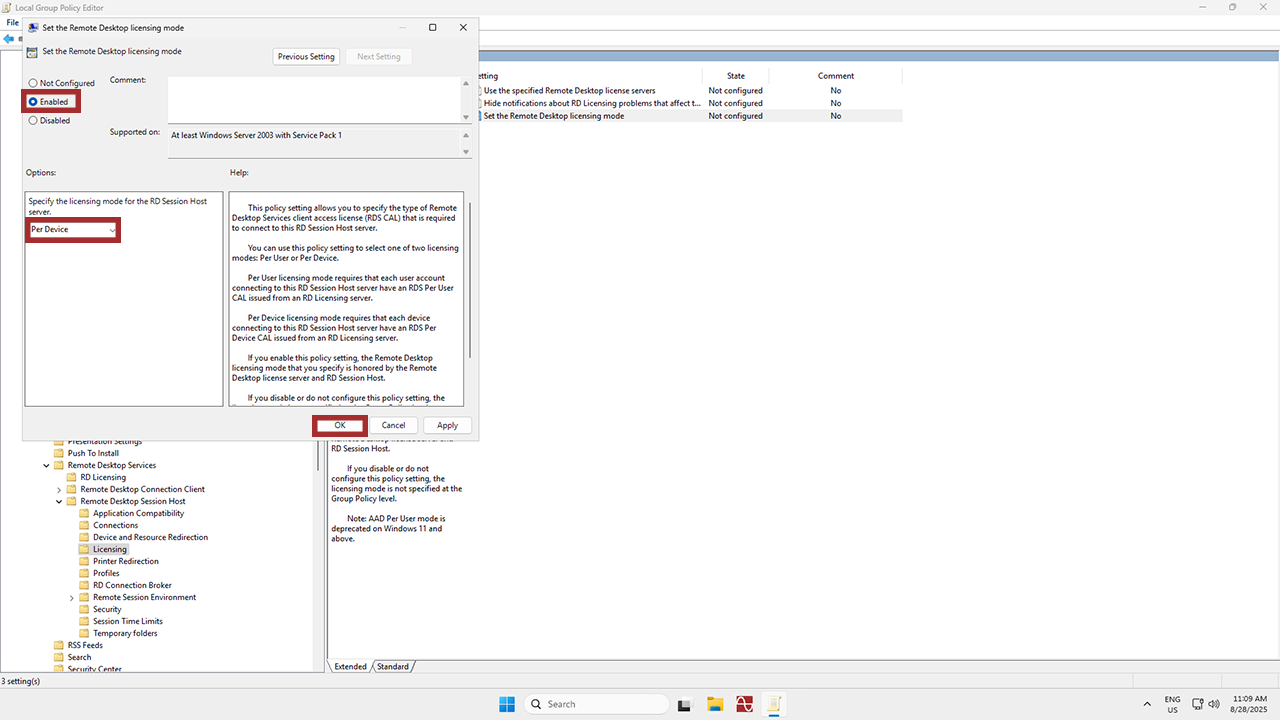 Check to make sure this policy is Enabled and set to Per Device. Then hit OK.