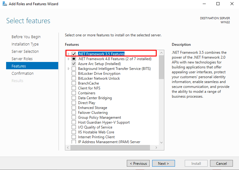 During the installation, you might notice that some features (e.g., .NET Framework 3.5) are missing. You’ll need to install .NET Framework 3.5 features manually.