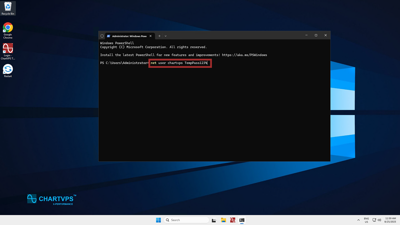 With PowerShell open, copy and paste the command below into it and press Enter to change the password for a specific user. Remember, you need to replace username with your actual username and password with your desired password: