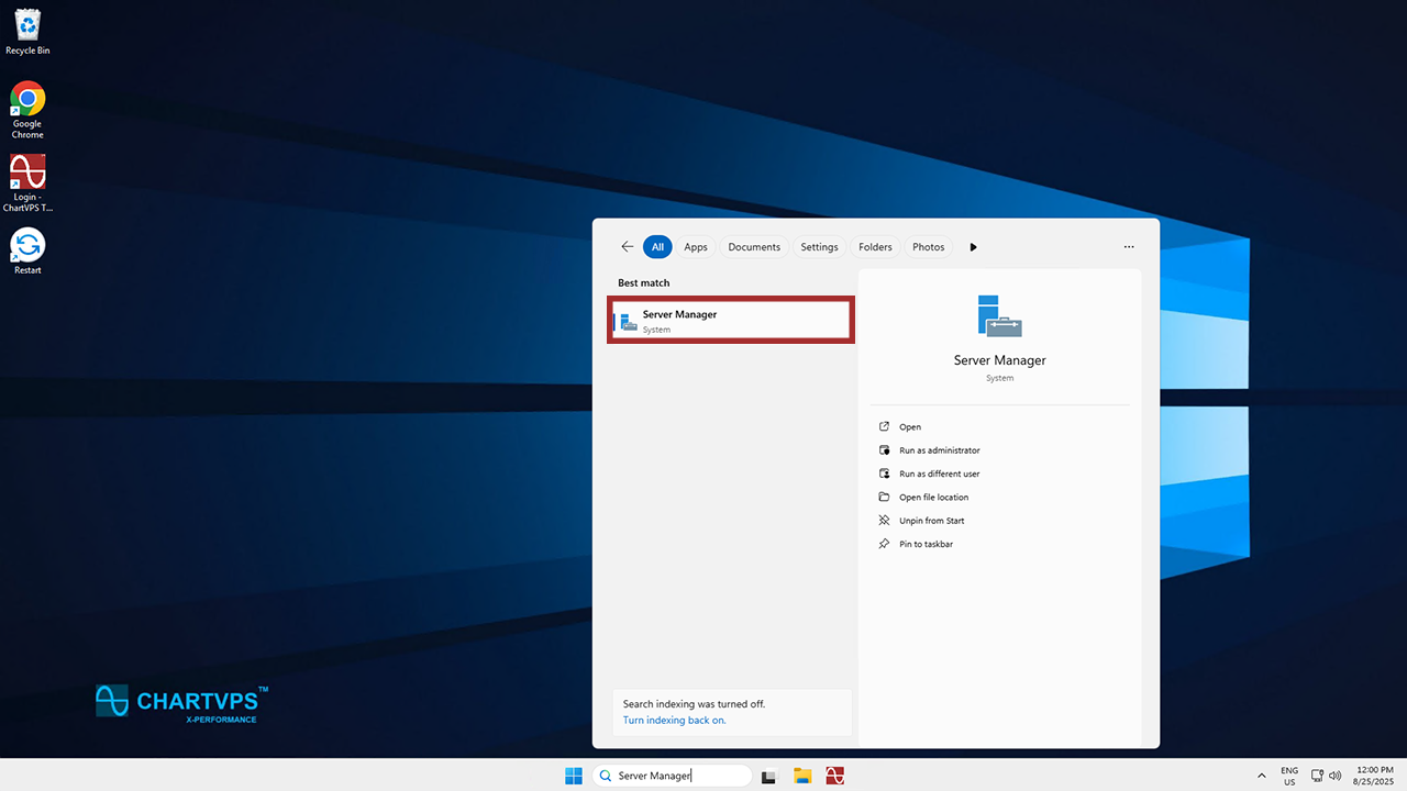To start, you’ve got to open Server Manager. Search for “Server Manager” in the Windows bar, then click it.