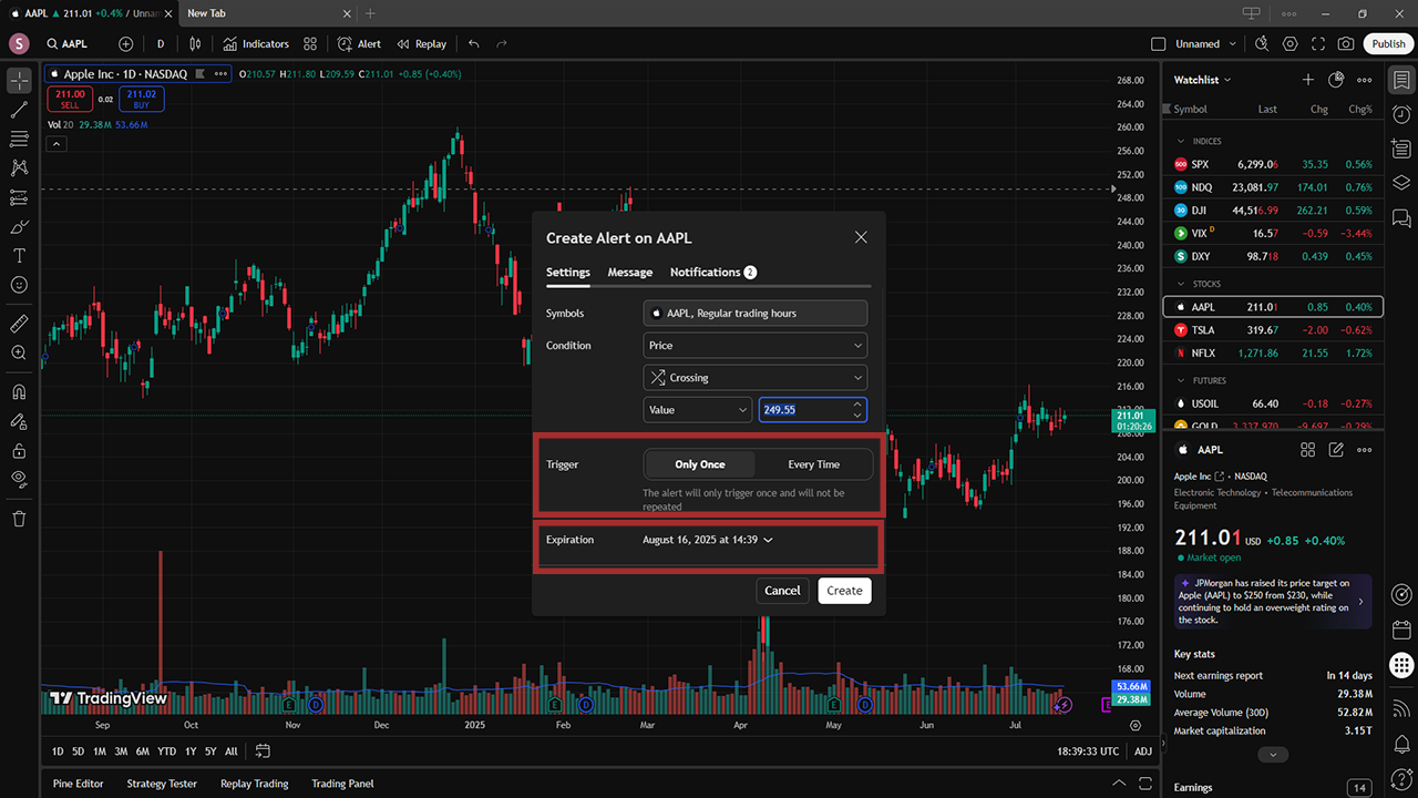 Now you’ve got to specify the alert’s settings. Set a Value, which is a price level in our example, at which you want your alert to be triggered. Then choose the Crossing option. This makes it so the alert will be triggered once the value you previously set is crossed from either above or below.