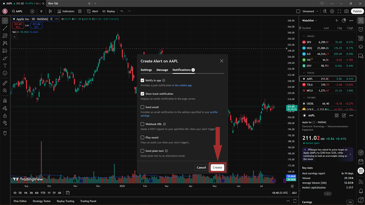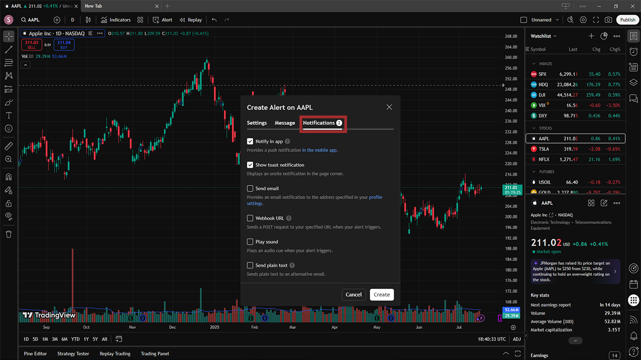 • A toast notification in the corner of the page: A pop-up message will show up on your computer, regardless of if you’re in another tab. Remember though, you need to allow TradingView to show desktop notifications for this one to work outside of TradingView.