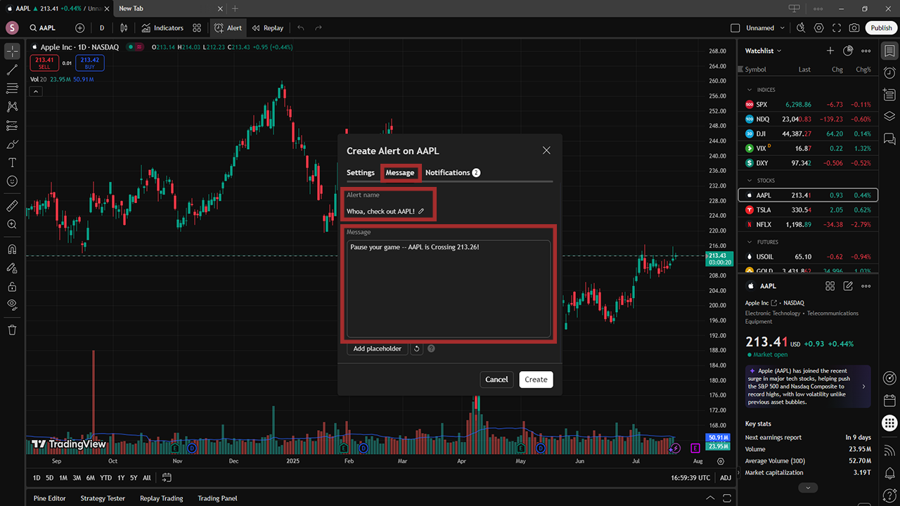 • You’ll definitely want to make sure you pick the correct indicator that you want to set up an alert for. For this example, we’re using the Apple (AAPL) price action.